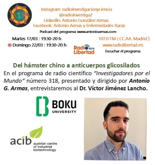 - Doctor Víctor Jiménez Lancho. Experto en ingeniería genética y el desarrollo de líneas celulares para la expresión de proteínas terapéuticas. Miembro de la Asociación de Científicos Españoles Residentes en Austria (ACERA), durante su doctorado en la BOKU Universität en Viena, se dedicó al desarrollo de líneas celulares usando el famoso modelo celular Chinese Hamster Ovary cells (CHO cells), con una potente capacidad de producir proteínas y adaptación a escenarios de estrés. Posteriormente, continuó su etapa investigadora en el extranjero, en Francia, donde trabajó para una start-up biotecnológica desarrollando proteínas terapéuticas con glicanos modificados que potencian su actividad. Actualmente, se encuentra de nuevo en Viena investigando para una empresa que desarrolla anticuerpos monoclonales contra el cáncer, que llevan adheridas moléculas anticancerígenas, combinando la especificidad de los anticuerpos y la potente actividad anticancerígena de las moléculas químicas.