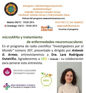 - Dra. Lara Rodríguez Outeiriño. Investigadora posdoctoral en la Universidad de Galway, donde estudia el potencial terapéutico de los microARN en enfermedades neuromusculares como la sarcopenia y la ELA. Forma parte y colabora en la coordinación del Galway RNA Research Cluster, dedicado al desarrollo de biomarcadores y terapias basadas en ARN. Obtuvo su doctorado en la Universidad de Jaén, donde investigó durante ocho años el papel de los microARN en la distrofia muscular de Duchenne, identificando un microARN clave en la regeneración muscular. Además, apuesta por la divulgación científica, tanto especializada como general, como una herramienta clave para acercar la investigación a la sociedad. Agradecemos a la asociación de investigadores españoles en Irlanda su colaboración para generar esta entrevista.